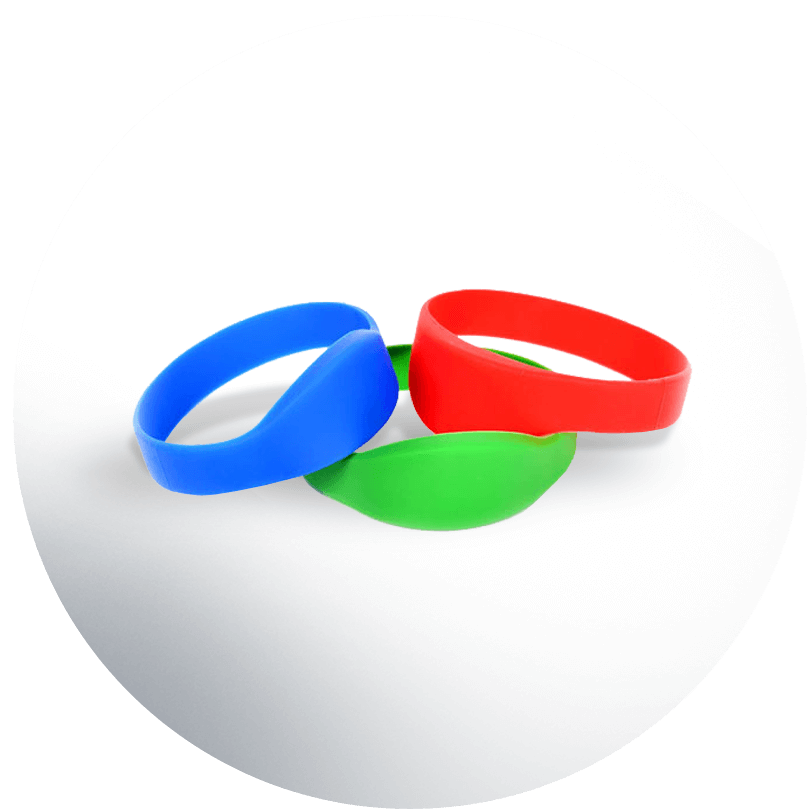 Made from silicone RFID wristbands and bracellets are durable and 100% waterproof. Wristband and bracellets can be ordered in manny different colors and shapes.